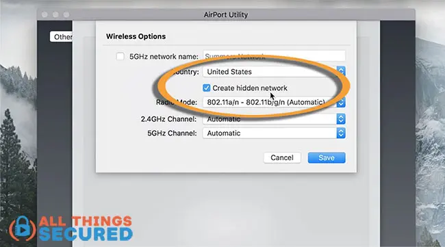 Apple does a good job of making things simple (as they usually do). Under Advanced Settings in the wireless menu, you’re going to find and check the box that says “Create a Hidden Network”.