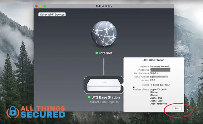 Once the AirPort Utility app is opened, you’ll click the Airport device you’re using and then click “Edit”.