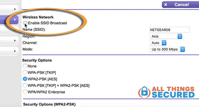 In the Netgear WiFi router that I’m using for this example, what I found is a setting that says “Enable SSID Broadcast”. SSID stands for “Service Set Identifier”, but that’s not important.
